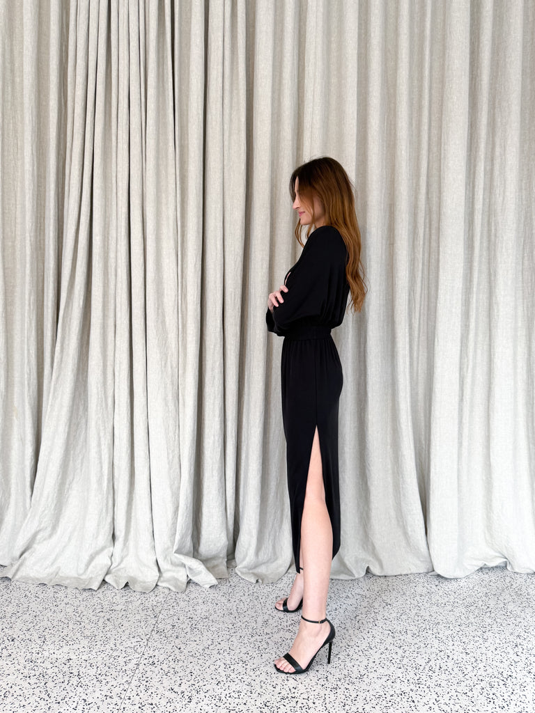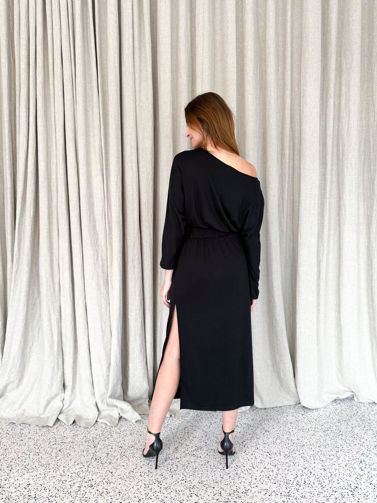Sleek, versatile, and effortlessly chic – this black one-shoulder midi dress is your go-to piece for any special occasion. Designed with a flattering elastic waist and a daring thigh-high side split, it balances elegance with a hint of allure.